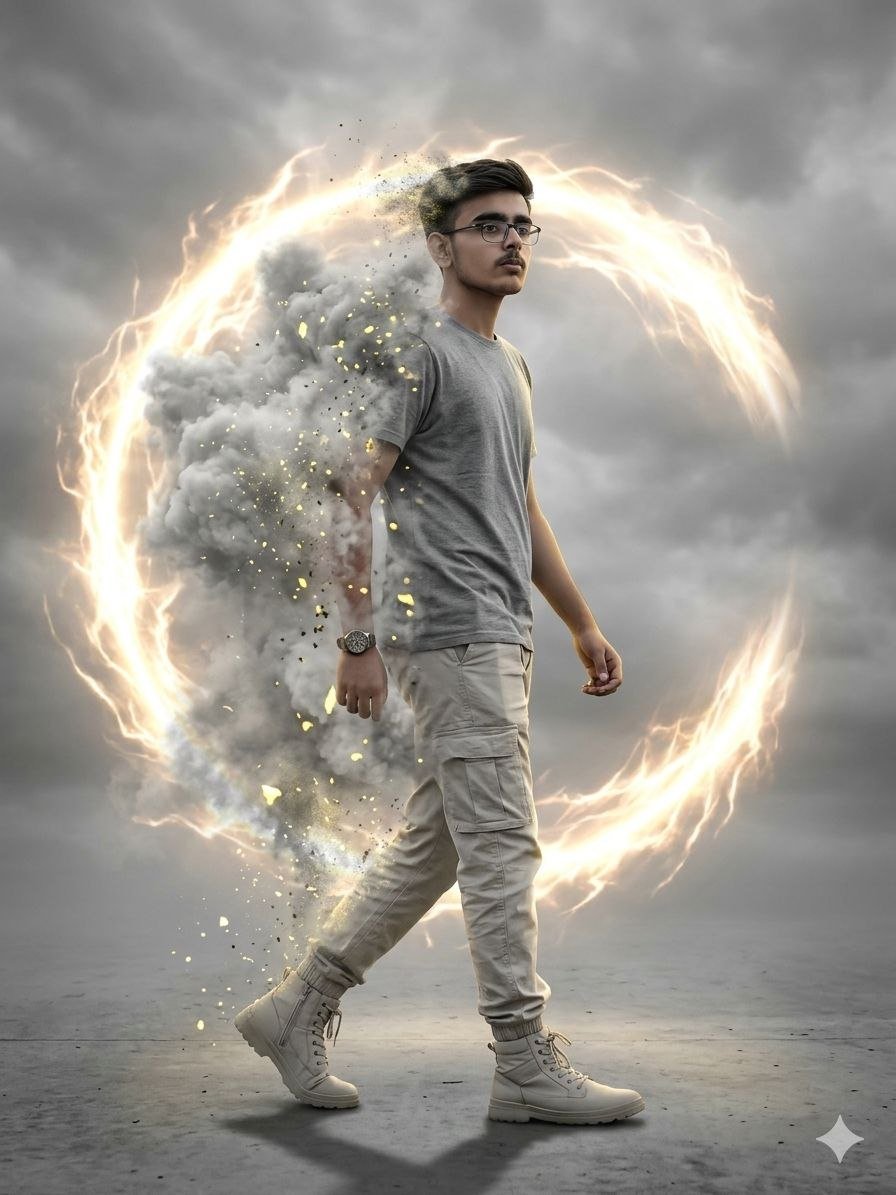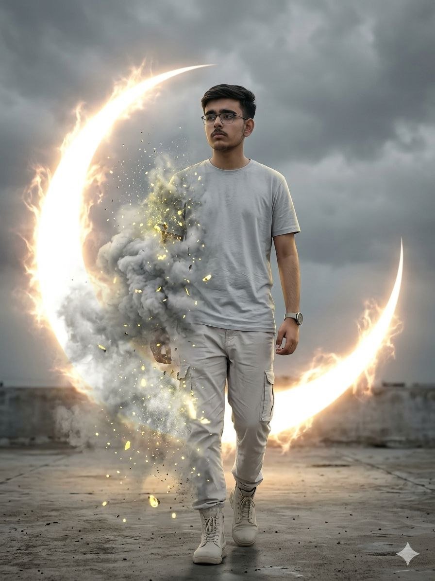 This editing style is not just about enhancing an image—it’s about telling a story. It creates a cinematic illusion where a person appears to be stepping through a glowing ring of fire, transitioning between dimensions, or unlocking hidden powers. The combination of fire, smoke, light particles, and realistic shadows gives the image a movie-like appearance that instantly grabs attention.