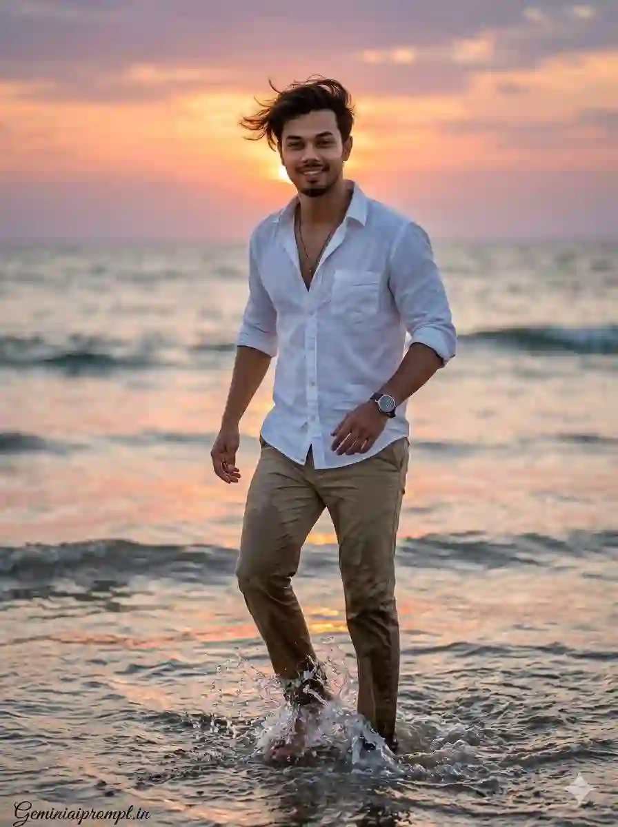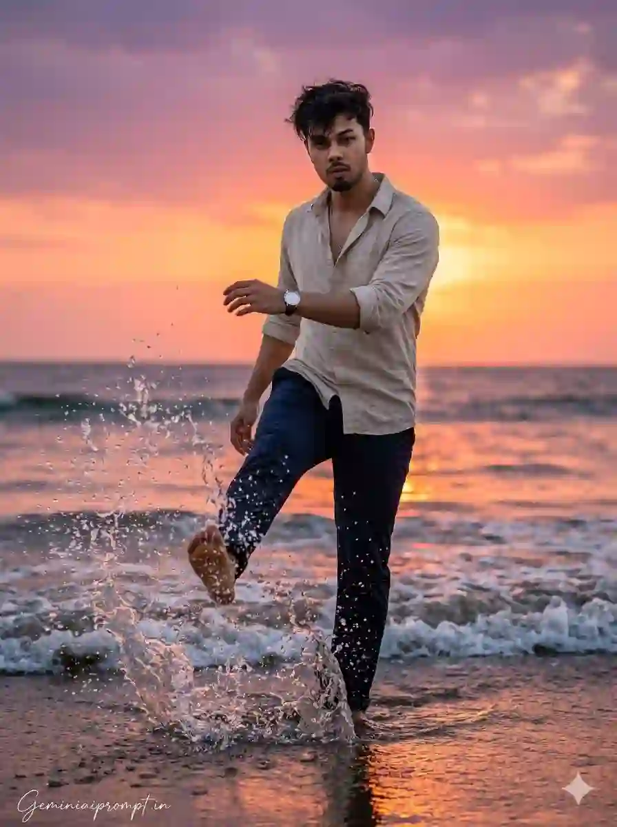 Create a hyper-realistic cinematic beach portrait of a stylish young man captured during a colorful sunset on a tropical coastline. The photograph should look like a high-end lifestyle editorial image with extremely sharp facial clarity and vibrant natural colors. FACE LOCK — ZERO MODIFICATION POLICY Use the uploaded reference face exactly as the facial identity source. The face must remain 100% identical to the reference image with zero alteration. Maintain the same eye shape, eyelids, nose bridge, lips, jawline, facial proportions, natural skin tone, and hairstyle. Do not apply beautification filters or smoothing. Preserve natural pores and realistic skin texture so the face appears perfectly recognizable in ultra-HD detail. ASPECT RATIO • 3:4 vertical STYLE Ultra-realistic DSLR beach photography, cinematic lifestyle portrait, sunset lighting, shallow depth of field, HDR lighting, 8K ultra detail. SCENE DESCRIPTION A beautiful seaside landscape during sunset with gentle waves rolling toward the shore and warm glowing light reflecting across the water. POSE & ACTION The young man stands on wet sand lifting one foot and playfully kicking a wave toward the camera, creating a dramatic splash of crystal-clear water droplets frozen mid-air. OUTFIT DETAILS Relaxed light sand-colored beach shirt with rolled sleeves paired with dark navy trousers, slightly soaked by ocean water. ACCESSORIES Minimal silver wristwatch and thin necklace. HAIRSTYLE Soft messy hairstyle naturally moved by the coastal wind. BACKGROUND The ocean stretches across the horizon under a glowing sunset sky with orange, pink, and purple tones blending beautifully. LIGHTING Warm backlighting from the sunset creating subtle rim light around the subject’s shoulders and hair. CAMERA & STYLE Shot using a professional DSLR camera with 85mm portrait lens for extremely sharp facial detail and smooth cinematic background blur. NEGATIVE PROMPT blurred face, distorted anatomy, cartoon graphics, low resolution textures, watermark artifacts. TEXT / SIGNATURE Add “Geminiaiprompt.in” at the bottom-left corner, HANDWRITTEN SIGNATURE-STYLE typography, thin cursive strokes, small size, subtle premium elegance, white or soft off-white color.
