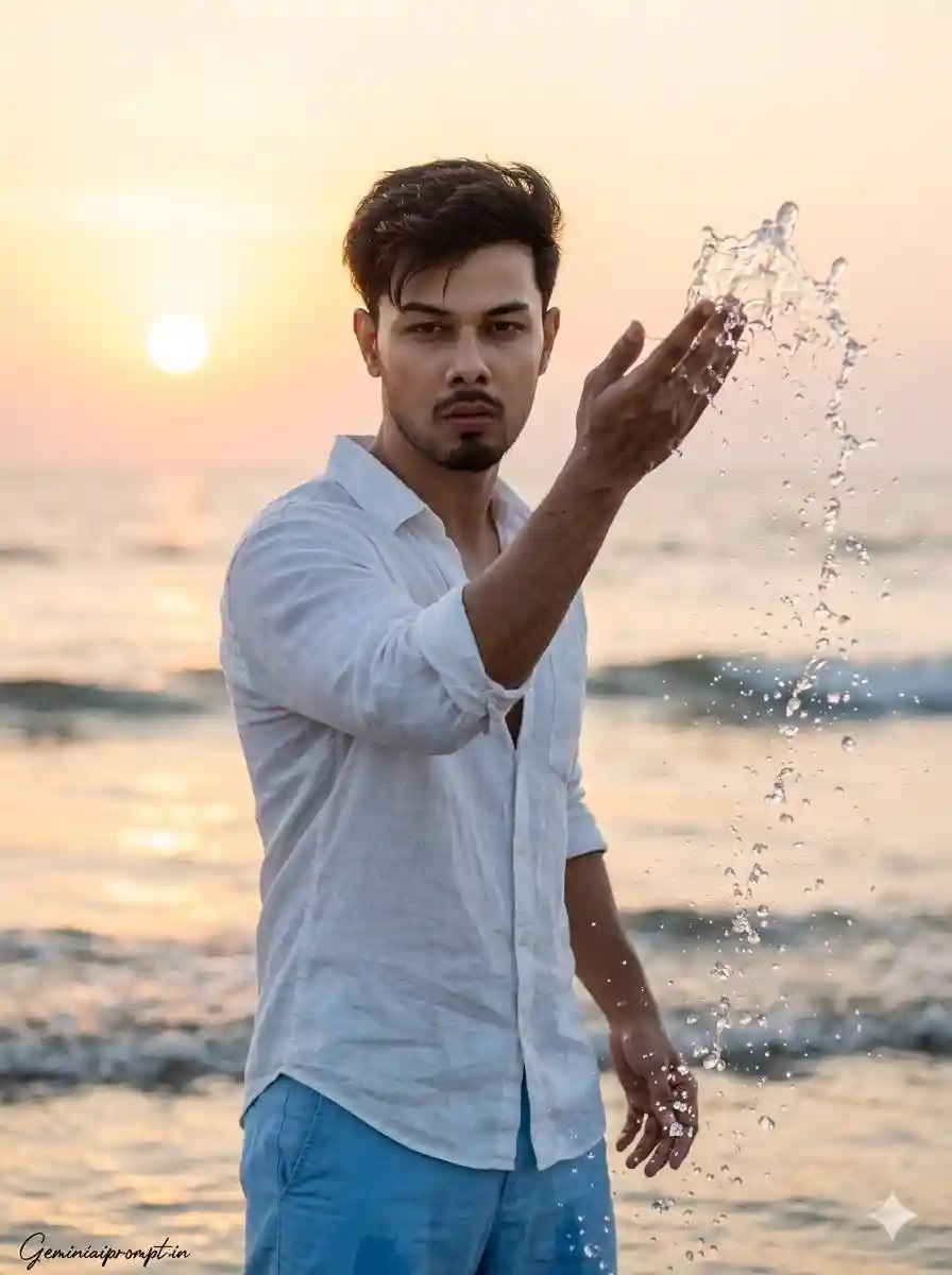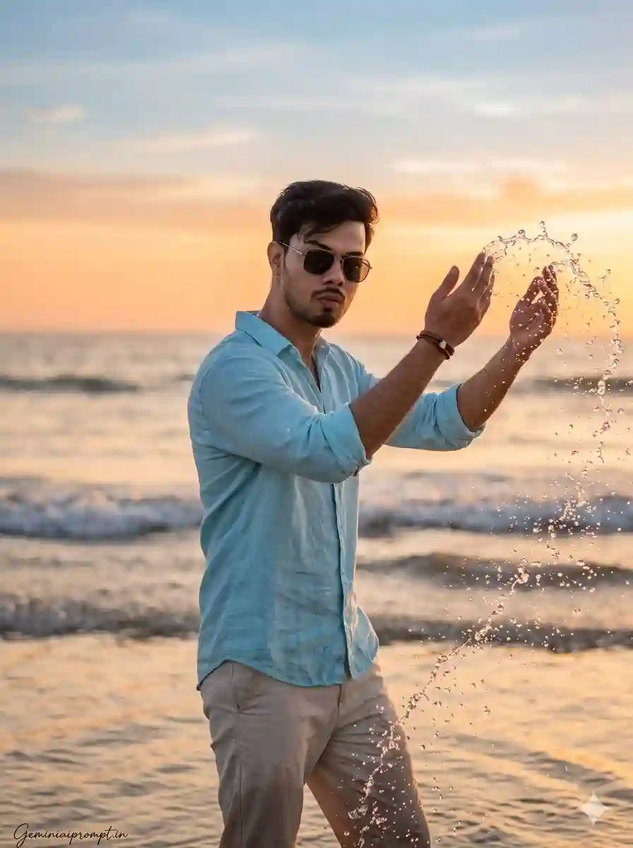 Create an ultra-realistic cinematic beach lifestyle portrait of a confident young man captured during a glowing sunset at the shoreline. The image should resemble a professional outdoor editorial photograph with dramatic natural lighting and extremely sharp facial clarity. FACE LOCK — ZERO MODIFICATION POLICY Use the uploaded reference face exactly as the only facial identity source. The face must remain 100% identical to the reference image with zero modification. Preserve the exact jawline, eye shape, eyelid folds, eyebrow thickness, nose bridge, lips, facial proportions, natural skin tone, and hairline. Do not apply beautification filters or artificial smoothing. Maintain natural skin pores and realistic facial texture so the identity appears extremely sharp and crystal clear in ultra-HD quality. ASPECT RATIO • 3:4 vertical STYLE Ultra-realistic DSLR beach photography, cinematic lifestyle portrait, golden hour lighting, shallow depth of field, HDR lighting, 8K ultra-detailed realism. SCENE DESCRIPTION A peaceful tropical beach during sunset with warm golden sunlight reflecting across the ocean surface and the wet sand. POSE & ACTION The young man stands at the edge of the water throwing a handful of ocean water upward, creating a sparkling splash of droplets around him. His body slightly twists toward the camera while the water arcs dramatically in the air. OUTFIT DETAILS Casual soft white linen shirt with rolled sleeves and light sky-blue beach trousers, slightly wet from the ocean waves. ACCESSORIES Simple leather bracelet and modern sunglasses. HAIRSTYLE Natural wind-blown hairstyle moving slightly with the sea breeze. BACKGROUND The horizon shows a vast calm ocean meeting a glowing sunset sky with warm orange and soft pink gradients blending into pale blue. LIGHTING Golden hour sunlight illuminating the subject from the side, creating glowing highlights on the water droplets and natural shadows on the sand. CAMERA & STYLE Captured using an 85mm DSLR portrait lens ensuring extremely sharp facial detail while the ocean background remains softly blurred. NEGATIVE PROMPT face blur, distorted anatomy, cartoon style graphics, artificial skin smoothing, extra limbs, watermark artifacts. TEXT / SIGNATURE Add “Geminiaiprompt.in” at the bottom-left corner, HANDWRITTEN SIGNATURE-STYLE typography, thin cursive strokes, small size, subtle premium elegance, white or soft off-white color.