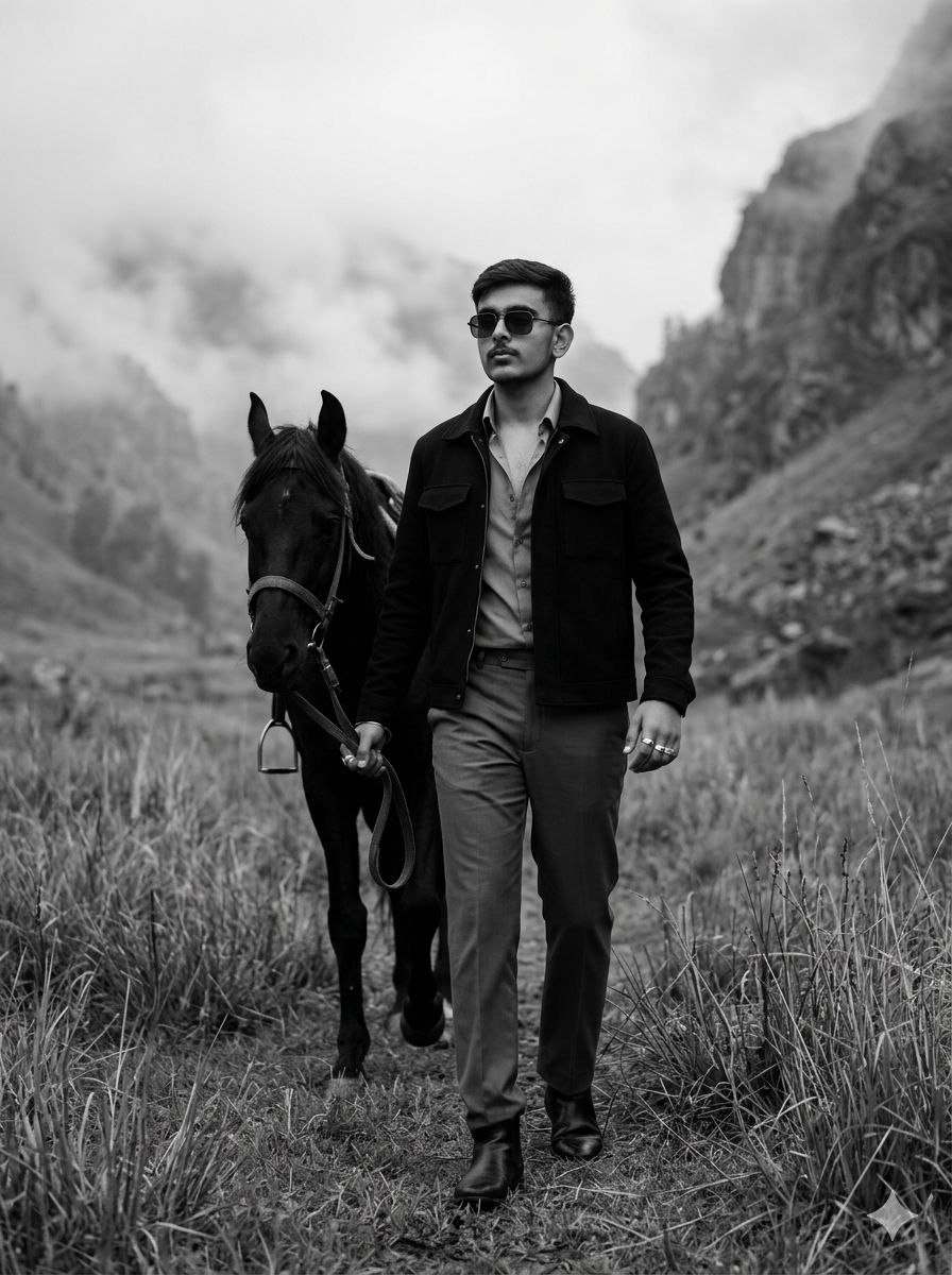 This image features a young stylish man walking confidently with a black horse. The background consists of foggy mountains, giving a cinematic and mysterious vibe.