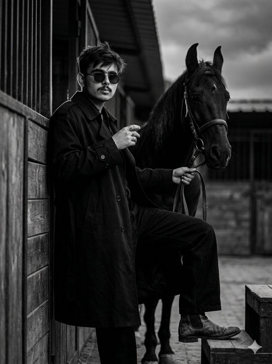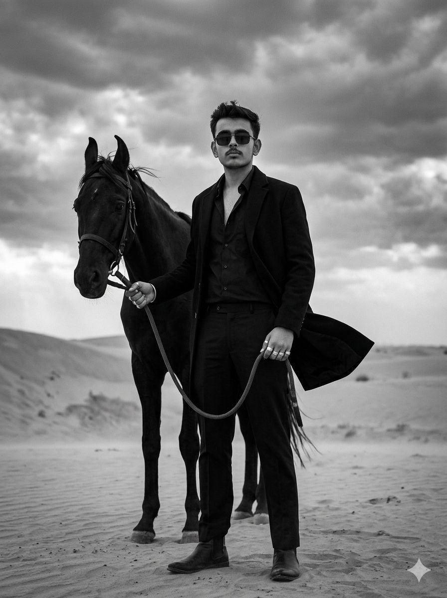 Agar tum apne cinematic man with horse AI photo prompt me “luxury outfit”, “formal wear”, ya “stylish clothing” add karte ho, to result aur bhi premium aayega.