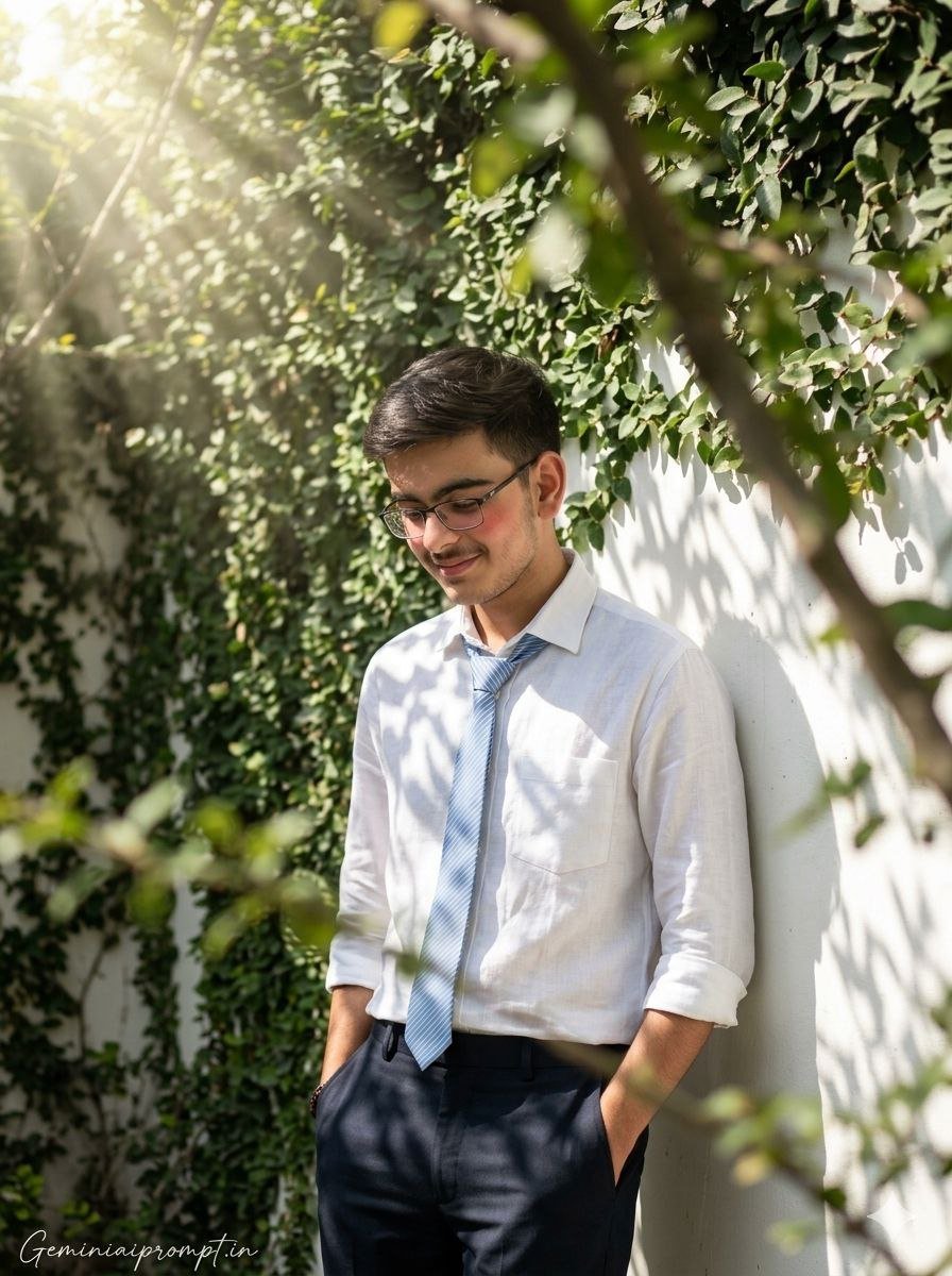 (Use uploaded reference face exactly, zero modification) FACE LOCK — ZERO MODIFICATION POLICY Face must remain 100% identical to the reference image. No reshaping, no beautification filters, no smoothing effects. Preserve natural facial proportions, pores, beard strands, and hairline. Ultra-HD crystal-clear sharp facial detail required. ASPECT RATIO • 3:4 vertical STYLE Ultra-photorealistic cinematic outdoor portrait photography. Soft green aesthetic with natural sunlight and artistic shadow play. 8K ultra-detailed professional DSLR look. SCENE DESCRIPTION A peaceful outdoor courtyard with a white painted wall partially covered in green ivy leaves, creating a calm green aesthetic atmosphere. Bright sunlight passes through tree branches above, creating dramatic god rays and dappled leaf shadows across the wall and subject. SUBJECT & POSE A handsome young man using the exact uploaded reference face, standing casually against the white wall. • Back lightly resting on the wall • Both hands relaxed inside trouser pockets • Head slightly tilted downward • Soft shy expression with a subtle blush OUTFIT DETAILS Crisp white linen shirt with rolled-up sleeves, paired with a light blue striped tie slightly loosened at the collar. Dark tailored trousers with natural fabric folds visible. HAIR & DETAILS Soft natural hairstyle with slightly tousled texture. Natural skin pores and realistic facial details clearly visible. ENVIRONMENT DETAILS Foreground includes blurred green leaves and branches, adding depth and framing. Small patches of sunlight create organic shadow patterns on the wall. LIGHTING Strong natural sunlight from the top left corner, producing cinematic god rays filtering through leaves. Distinct diagonal leaf shadows and slatted light patterns across the face and shirt. CAMERA & STYLE Shot with an 85mm portrait lens, eye-level composition. Ultra-sharp subject focus with soft natural depth of field. NEGATIVE PROMPT cartoon style, anime, CGI skin, blur, low resolution, plastic texture, distorted anatomy, watermark, logo.
