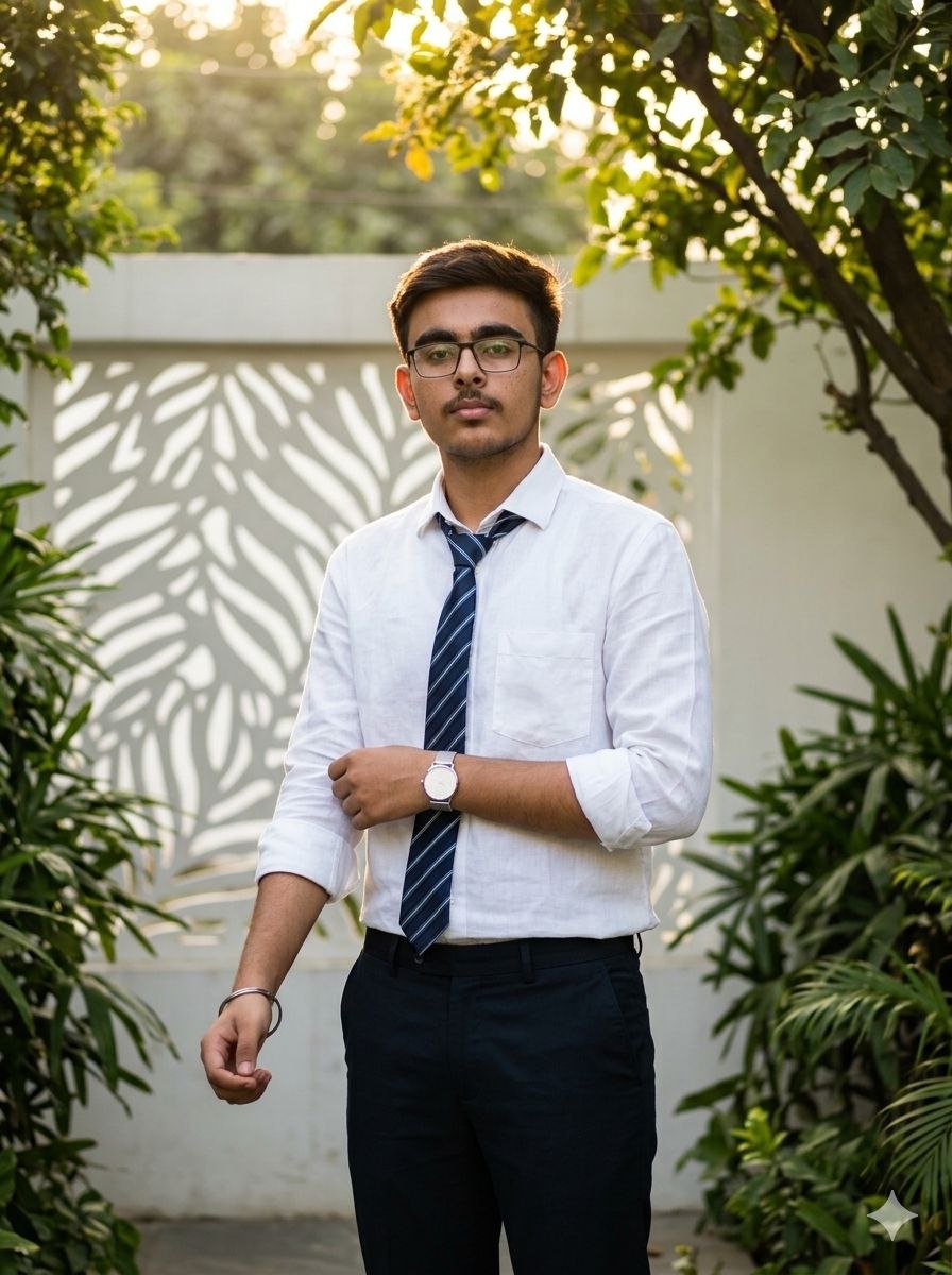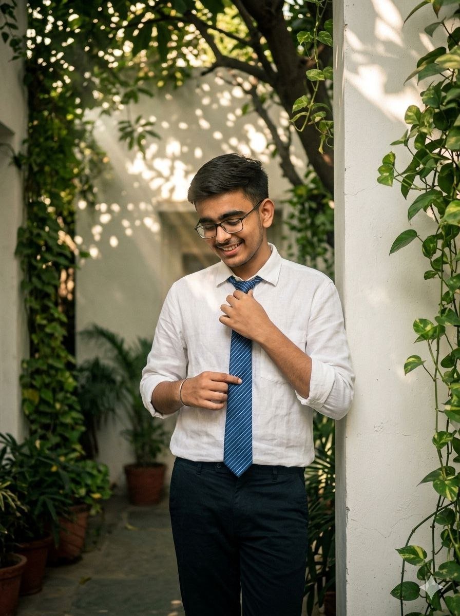 (Use uploaded reference face exactly, zero modification) FACE LOCK — ZERO MODIFICATION POLICY Face must remain exactly same as reference image. No reshaping, no beautification filters, no smoothing effects. Maintain original facial proportions, pores, beard detail and hairline. Ultra HD crystal-clear sharpness required. ASPECT RATIO • 3:4 vertical STYLE Ultra-realistic cinematic fashion portrait with natural garden lighting. Soft green color palette with warm sunlight highlights. Professional DSLR photography look, 8K detail. SCENE DESCRIPTION A quiet garden courtyard with a white wall and surrounding greenery. Sunlight filtering through tree branches creates soft circular leaf shadows across the wall. SUBJECT & POSE A handsome young man with the exact uploaded reference face standing confidently in the garden. • Body slightly angled to the camera • One hand adjusting the rolled sleeve • Other hand casually inside pocket • Calm confident expression OUTFIT DETAILS Elegant white linen shirt with rolled sleeves, paired with blue striped tie slightly loosened. Dark fitted trousers and clean minimalist watch. HAIR & DETAILS Hair softly illuminated by sunlight from behind. Natural skin pores and micro facial texture clearly visible in HD. ENVIRONMENT DETAILS Green plants and leaves frame the edges of the scene. White wall reflects soft sunlight creating natural glow. LIGHTING Warm golden sunlight passing through tree leaves. Creates organic leaf shadow patterns across shirt and background. Subtle rim light highlighting hair edges. CAMERA & STYLE Shot on professional DSLR with 50mm portrait lens. Eye-level cinematic composition with shallow depth of field. NEGATIVE PROMPT cartoon style, CGI skin, blur, low resolution, distorted body, extra limbs, watermark, logo.