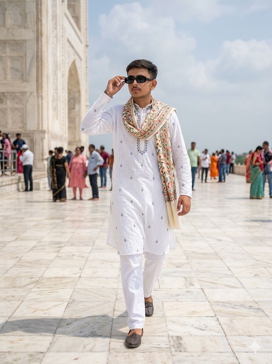 Keep my face 100% same as in the reference image) FACE MATCHING INSTRUCTIONS (STRICT IDENTITY PRESERVATION): Face must remain exactly same as reference image. No age change. No skin tone change. No beautification. No smoothing filter. No expression alteration. Maintain exact lip position, eye shape, eyebrow curve, beard thickness, facial proportions. Ultra-HD razor sharp clarity on face, zero blur. ASPECT RATIO • 3:4 vertical IMAGE STYLE: Ultra-realistic DSLR outdoor photograph. Natural color science. High resolution, ultra-detailed textures. 0% artificial look. Completely realistic. SUBJECT: Young athletic male, wheatish complexion, short black hair, trimmed beard, wearing black rectangular sunglasses. OUTFIT DETAILS: White kurta with subtle black embroidery detail. White pajama. Colorful embroidered stole flowing naturally behind shoulders. Fabric texture and stitching clearly visible. POSE DETAILS (DIFFERENT POSE): Walking forward confidently on marble pathway. Right leg stepping forward mid-motion. Left hand lightly adjusting sunglasses. Right arm relaxed by side. Natural stride posture, body slightly angled. EXPRESSION DETAILS: Exact same serious calm expression as reference image. No smile added. No emotion exaggeration. BACKGROUND DETAILS: Iconic white marble monument centered behind subject. Tourists scattered at distance. Bright sky with soft natural clouds. Polished marble flooring reflecting subtle light. LIGHTING DETAILS: Even midday sunlight. Natural soft shadow cast on marble floor. Balanced exposure without harsh contrast. CAMERA & COMPOSITION: Full-body vertical frame. Eye-level camera angle. DSLR 50mm lens look. Subject extremely sharp. Background slightly softened for depth but clearly detailed. NEGATIVE PROMPT: Face distortion, identity change, smooth plastic skin, blur, low resolution, CGI effect, cartoon look, extra limbs, deformed anatomy, watermark, logo, random text artifacts.