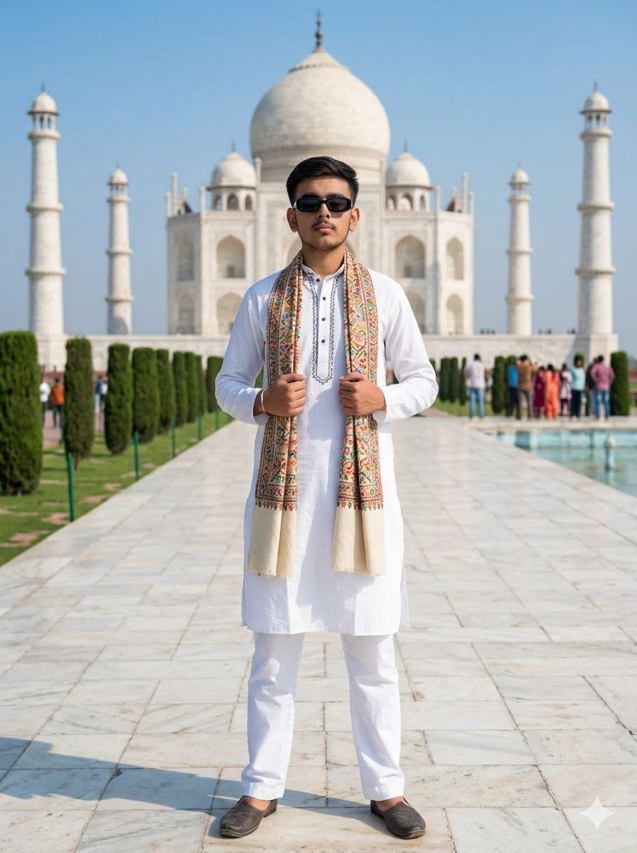 Keep my face 100% same as in the reference image) FACE MATCHING INSTRUCTIONS (ABSOLUTE LOCK): Face must remain exactly identical to the reference image. No face reshaping. No beautification. No symmetry correction. No skin smoothing. No expression change. No jawline, nose, eye, eyebrow, lip, or cheek alteration. Preserve natural pores, beard density, real skin texture. Face must look untouched and perfectly recognizable in ultra-HD clarity. ASPECT RATIO • 3:4 vertical IMAGE STYLE: Ultra-realistic DSLR photograph, looks like captured with professional full-frame camera, natural colors, extreme sharpness, high dynamic range, zero CGI look, zero cartoon feel, completely photorealistic. SUBJECT: Young handsome male, athletic build, medium height, wheatish skin tone, short black hair, neatly trimmed beard, wearing rectangle black sunglasses. OUTFIT DETAILS: Elegant white kurta with minimal black embroidery on collar and placket, matte cotton fabric texture clearly visible. White straight pajama. Multicolor embroidered traditional stole draped around neck flowing slightly due to breeze. Black rectangle sunglasses with realistic light reflection. POSE DETAILS (NEW DIFFERENT POSE): Confident royal stance – standing straight with both hands gently holding edges of stole near chest. Feet slightly apart. Shoulders relaxed. Head facing forward toward camera. Body centered and balanced. EXPRESSION DETAILS: Exact same neutral expression as reference image. No added smile. Cool, calm, serious presence. BACKGROUND DETAILS: Grand white marble monument with tall minarets and central dome. Green hedges along marble pathway. Tourists visible far in background (small scale, slightly soft focus). Clear bright blue sky. LIGHTING DETAILS: Bright natural daylight. Soft balanced sunlight across face. Natural shadows under chin and around folds. No harsh overexposure. CAMERA & COMPOSITION: Full-body vertical shot. Eye-level DSLR framing. Subject razor sharp. Background slightly depth-soft but fully recognizable. Professional 85mm lens feel. NEGATIVE PROMPT: Blur, motion blur, low resolution, cartoon style, CGI texture, artificial skin, extra fingers, deformed hands, distorted face, watermark, logo, unwanted text, oversharpen halos.