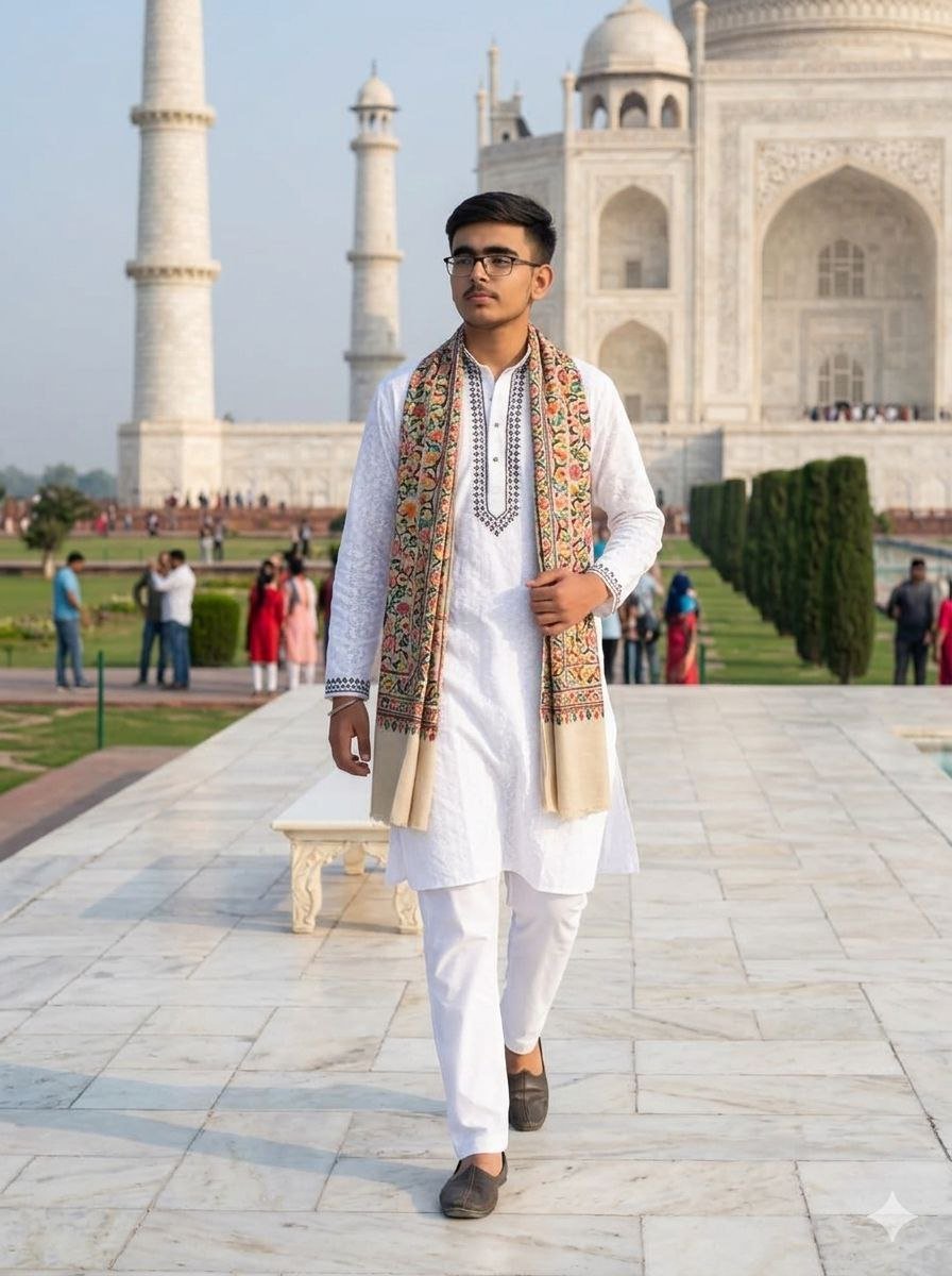Keep my face 100% same as in the reference image) FACE MATCHING INSTRUCTIONS — ABSOLUTE 100% IDENTITY LOCK: Face must remain exactly identical to the reference image. No reshaping, no beautification, no smoothing, no symmetry correction. No smile adjustment. No expression modification. No skin tone change. Preserve exact lip shape, eye alignment, eyebrow curve, jawline structure, beard density, and natural pores. Face must appear ultra-HD sharp, crystal clear, zero blur, fully recognizable and untouched. ASPECT RATIO • 3:4 vertical IMAGE STYLE: Ultra-realistic DSLR outdoor portrait. Natural daylight colors. Extreme sharp focus. Ultra-high resolution detail. 0% CGI, 0% illustration, fully photorealistic. SUBJECT: Young athletic male, medium height, wheatish skin tone, short black hair, neatly trimmed beard, wearing rectangle black sunglasses with natural light reflection. OUTFIT DETAILS: White kurta with minimal black embroidery on collar and placket. Matte cotton texture visible. White straight pajama with natural crease folds. Multicolor embroidered traditional stole draped around neck, slightly lifted by breeze. POSE DETAILS — SIDE WALK VARIATION: Walking diagonally across marble platform (not straight toward camera). Left leg stepping forward. Right hand lightly holding edge of stole near shoulder. Left arm swinging naturally. Body angled slightly to left for cinematic depth. EXPRESSION DETAILS: Exact same neutral serious expression from reference image. Cool, calm, confident presence. No added smile. BACKGROUND DETAILS: Grand white marble monument positioned slightly off-center behind subject. Tall minarets and central dome visible. Tourists small and distant. Green hedges along pathway. Polished marble floor reflecting subtle sunlight. LIGHTING DETAILS: Bright natural daylight. Even illumination on face and outfit. Soft natural shadow cast behind subject. Balanced exposure, no harsh highlights. CAMERA & COMPOSITION: Full-body vertical frame. Eye-level DSLR perspective. 85mm lens compression feel. Subject razor sharp. Background slightly softened but clearly visible. NEGATIVE PROMPT: Face alteration, blur, motion blur, plastic skin, beautification, distorted anatomy, extra fingers, warped limbs, CGI texture, cartoon effect, watermark, logo, unwanted text artifacts.